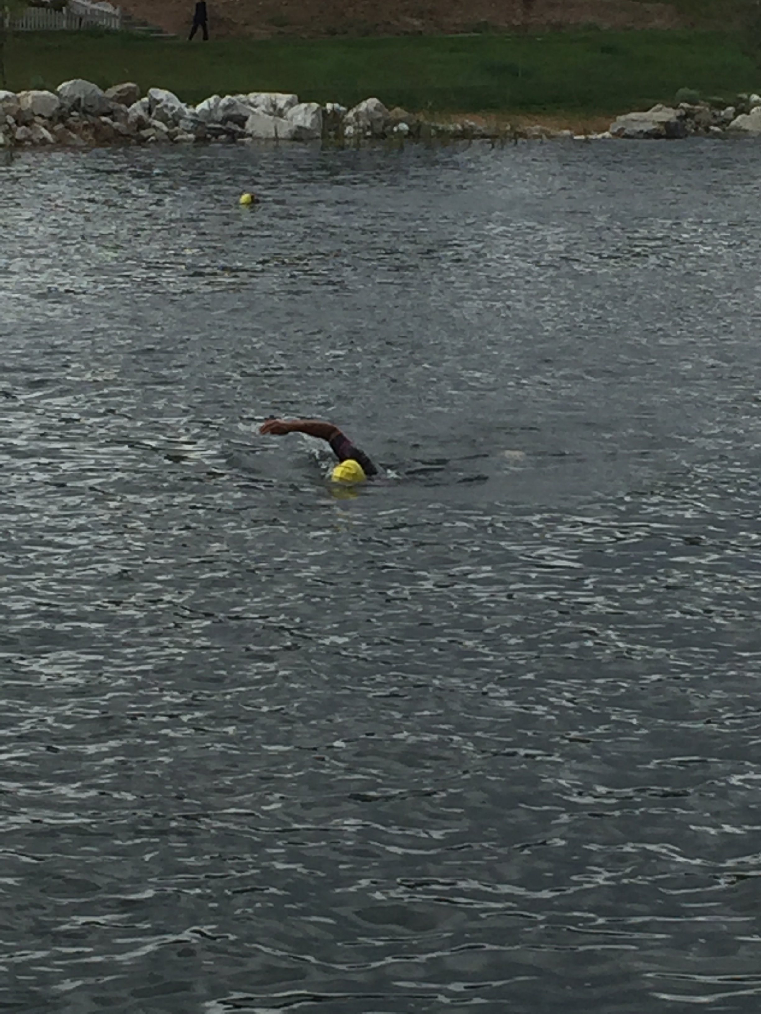 Instead, I prayed the rain would stop so I could do my best and not freeze. And — it did stop raining just as I parked at the venue. The water was warmer than the reservoir where I practice, and I was completely dry by the time I hopped off the bike. The clouds held off until well after I’d finished racing. (Only my poor award certificate suffered.)