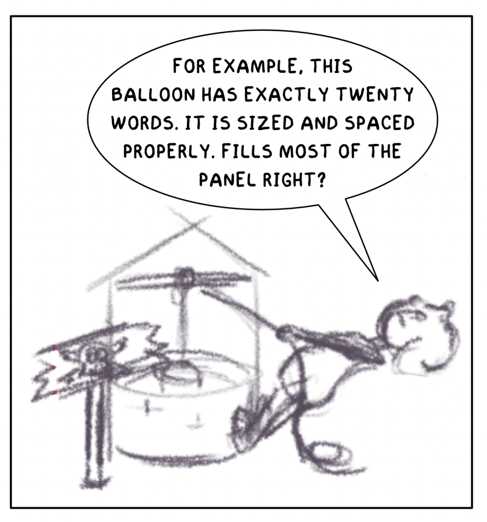 In the above sample, the balloon fills a large portion of the panel. Any more words, and it would intrude on the illustration. This panel is average sized, so a bigger panel could accommodate more words, but you still don’t want to go too far because then the balance of the panel is off and readers will get fatigued. (I know it sounds silly when we’re talking fewer than fifty words.)