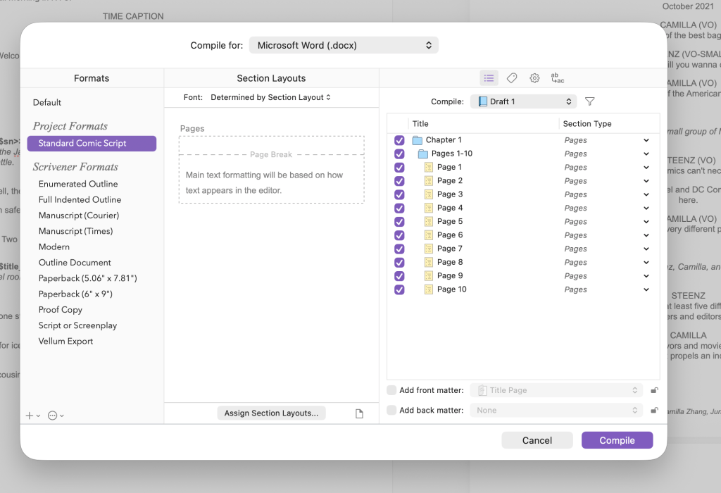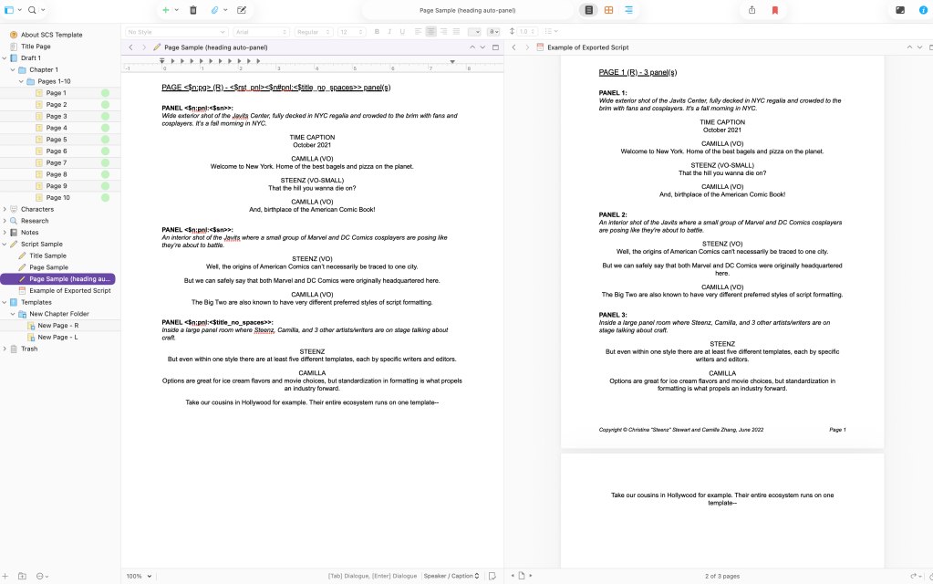 Scrivener comes with templates, but you can also upload or create new templates. For graphic novel scripts, I use the template created by Brigitta Blair, which uses the Standard Comic Script format developed by creators Camilla Zhang and Steenz.